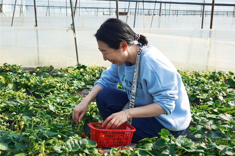 在采摘園內(nèi),女職工們踏著春天的泥土快步健走,零距離感受大自然風(fēng)光。草莓棚中,一畦畦碧綠的草莓秧下,一顆顆鮮艷欲滴的草莓散落在綠葉叢中,芬芳的果香撲鼻而來。雖然大棚里道路狹窄、空氣較為悶熱,但是每個人的熱情卻絲毫未減,大家邊采摘邊交流,現(xiàn)場氣氛輕松活躍,歡聲笑語不斷。